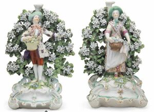 Derby Porcelain Bocage Figures of Shepherds. Marks for 1765 Depicting a shepherd and his companion, each holding a basket of flowers, on a pierced rocaille base 10 in. (25.4 cm.) high