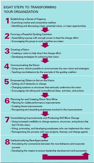 - 8.Make change stick - Reinforce the value of successful change via recruitment, promotion, new change leaders. Weave change into culture.